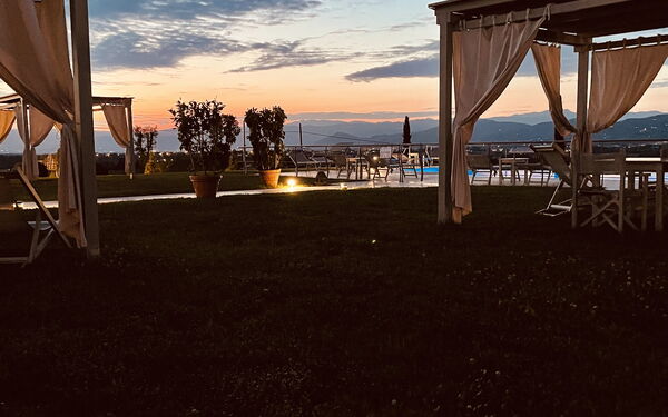 All'esterno, il complesso è circondato da un giardino panoramico che ospita una bella piscina e dei gazebo attrezzati per potersi rilassare e rinfrescare nelle calde giornate estive. I proprietari vivono in una sezione della proprietà e occasionalmente usano la piscina (dotata di impianto di depurazione a sale).